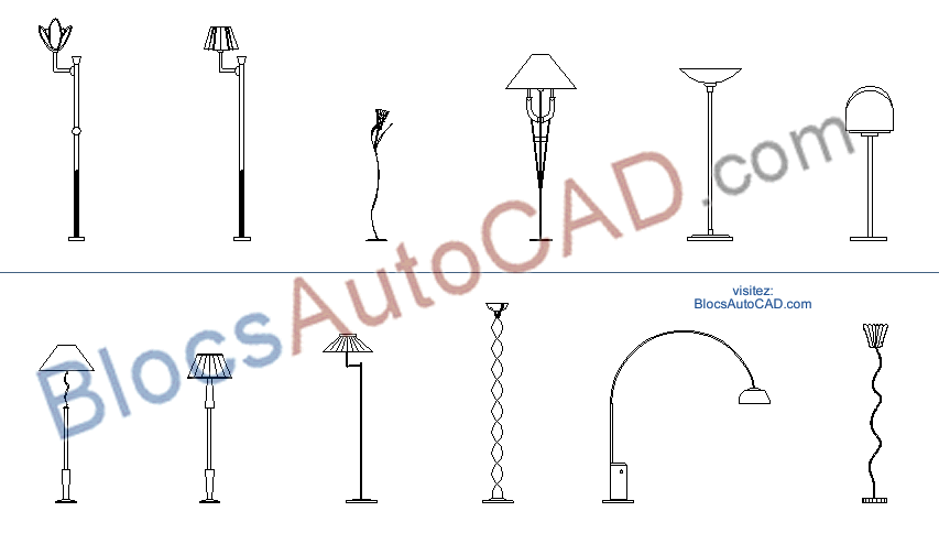 12 autocad ALTA ILUMINACIÓN de alta calidad: lámparas torchiere, lámparas de pie de arco, arts & Misión de manualidades, tarea: lámparas de lectura, lámparas de sombra artísticas y otras lámparas de pie (bloques dwg de autocad)